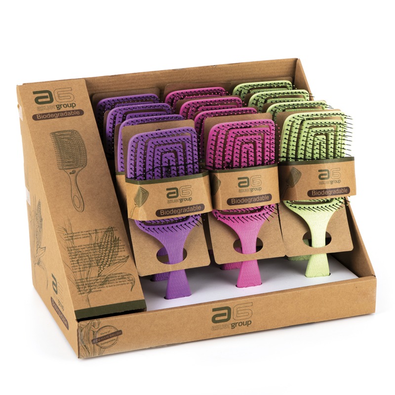 Los cepillos paleta grande AG ECO-FRIENDLY están diseñados para desenredar el cabello. Se trata de una fabricación revolucionaria al estar hechos de materiales biodegradables (yuca y maiz) y de gran resistencia. Las cerdas son de 2 cm, con punta redondeada que facilita el desenredado sin estresar el cabello. Es ideal para todo tipo de cabello. Disponible en 3 colores, rosa, verde y morado y en display con 12 unidades surtidas.