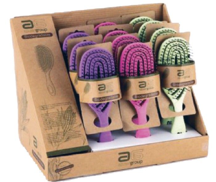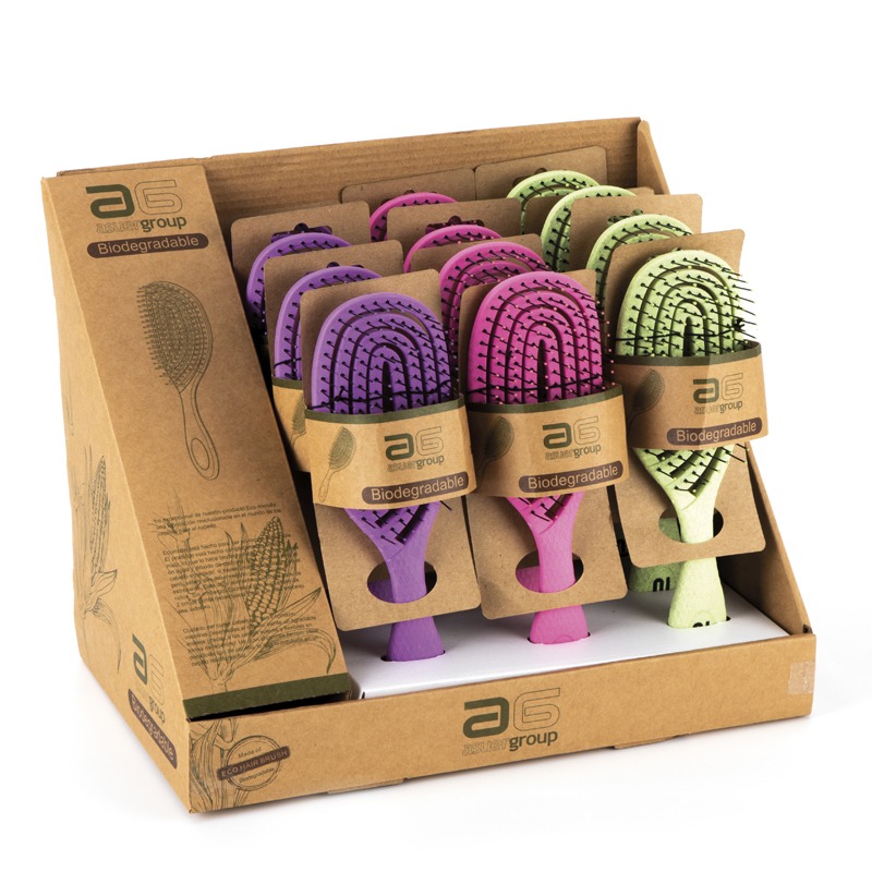 Los cepillos AG ECO-FRIENDLY ovalados están diseñados para desenredar el cabello. Se trata de una fabricación revolucionaria al estar hechos de materiales biodegradables (yuca y maiz) y de gran resistencia. Las cerdas son de 2 cm, con punta redondeada que facilita el desenredado sin estresar el cabello. Es ideal para todo tipo de cabello. Disponible en 3 colores, rosa, verde y morado y en display 12 unidades.