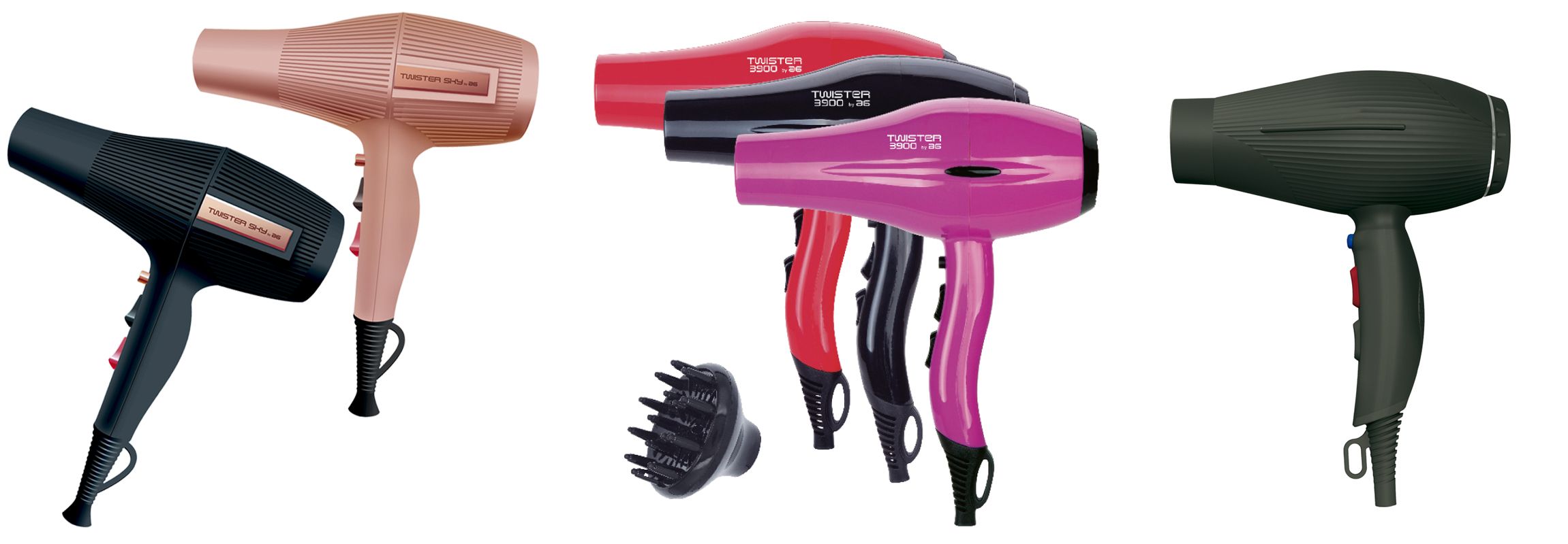Secador de pelo Twister SKY AG, de 2.400 w de potencia con un diseño compacto y ergonómico y motor AC de larga duración. Dos velocidades y botón de aire frio, Dispone de 2 boquillas, y un cable extra largo de 3 metros. Está disponible en 2 colores, negro y rose gold. Secador de pelo profesional Twister 3900 AG con difusor de 2.200 w de potencia con un diseño compacto y ergonómico y motor AC de larga duración. Dispone de tecnología iónica que evita la electricidad estática y la deshidratación del cabello. Dos velocidades y botón de aire frio, Dispone de 2 boquillas, un difusor y un cable extra largo de 3 metros. Está disponible en 3 colores diferentes. Secador de pelo profesional Twister PIUMA AG Ultraligero. Secador de 2.300 w de potencia con motor brushless de bajo nivel de ruido y bajo mantenimiento. Diseño compacto y ergonómico. Dispone de tecnología iónica que evita la electricidad estática y la deshidratación del cabello. Dos velocidades y botón de aire frio. Incluye 2 boquillas y difusor. Cable extra largo de 3 metros y aros decorativos intercambiables. Peso ultraligero de 300 grs.