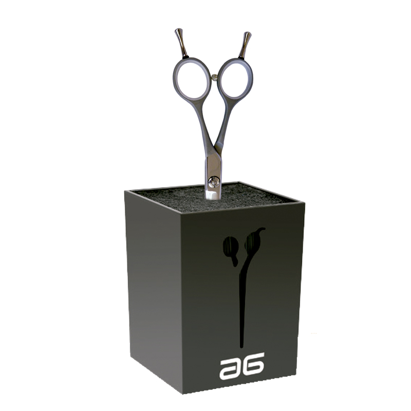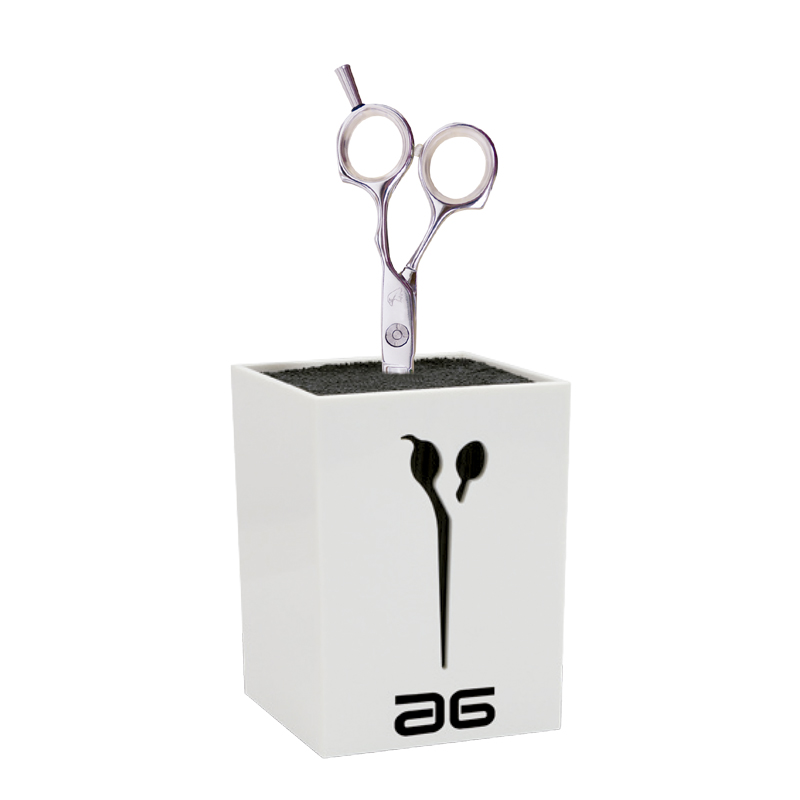 Contenedor o soporte para tijeras profesionales en color blanco o negro. Permiten guardar las tijeras en posición vertical sin que de dañe el filo de las mismas, Fácil limpiezas, Medidas: 8 cm x 8 cm x 10,5 cm