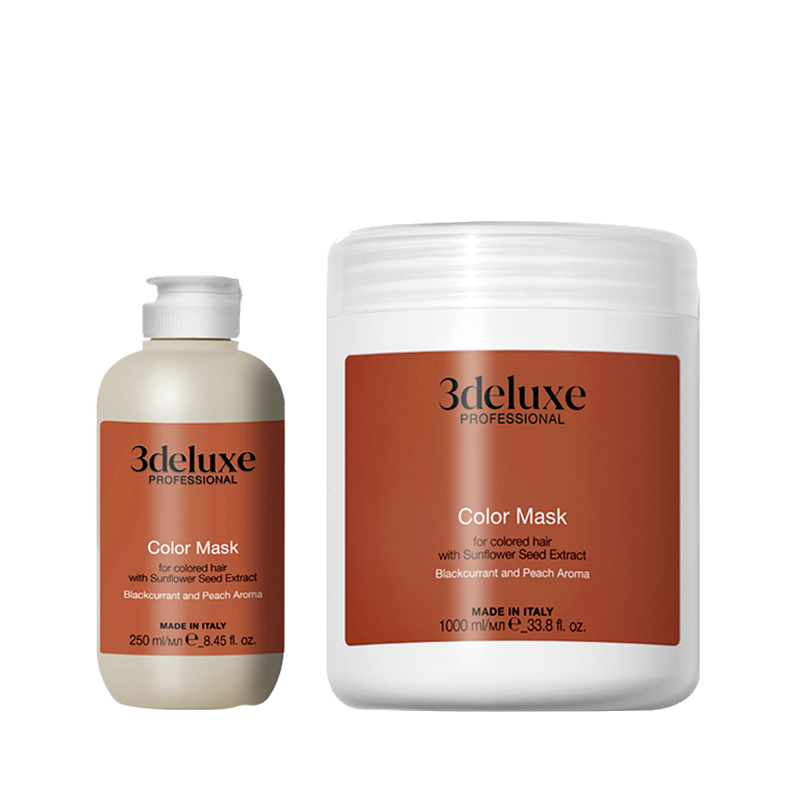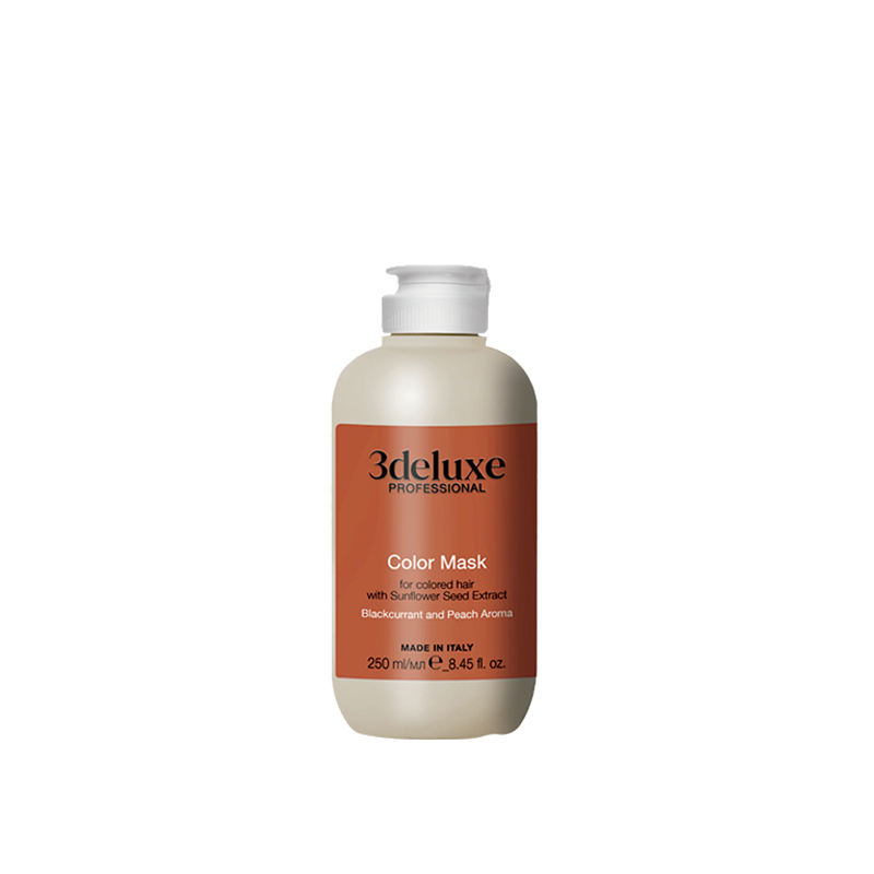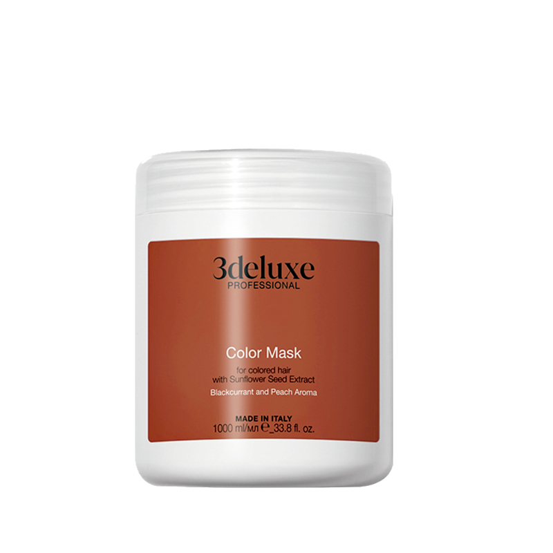 La máscara color 3DeLuXe para cabellos teñidos, mantiene y protege el color y la intensidad del cabello. Ideal para cabello teñido. Ingredientes naturales: extracto de semillas de girasol Aroma sensorial único: grosella negra y melocotón. Se presenta en 2 formatos: uno profesional de 1.000 ml y otro para la reventa de 250 ml. PRECIO ESPECIAL PARA PROFESIONALES REGISTRADOS.